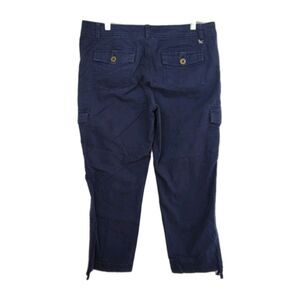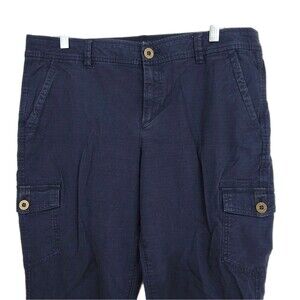 Elevate your casual wardrobe with Eddie Bauer's women's capri cargo pants in a classic navy blue. The size 8 pants are designed to provide a comfortable, regular fit for everyday wear. Made from a durable cotton blend fabric, these pants feature a flat front and a mid-rise waist that sits just right on the hips, ensuring a flattering silhouette.