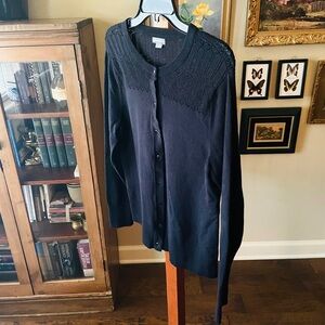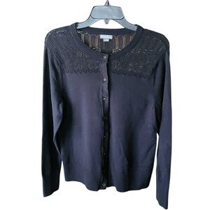 Eddie Bauer women’s long sleeve button cardigan sweater, open-knit shoulder detail, stretch, jewel-like buttons, cotton/nylon blend. Lightweight. Nice, versatile piece!