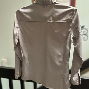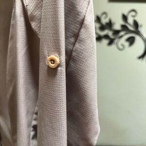 Stylish gray button-up shirt with long sleeves. Features a classic collar and button details. Excellent condition from a smoke free home. Length 25”, pit to pit 19”