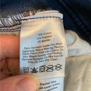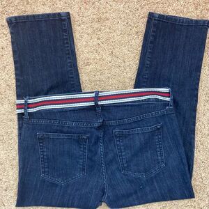Stylish cropped blue jeans that comes with its original striped belt. Dark wash w/ stretch. Cool pockets. Nautical vibes. Dress up or be casual. Waist is 15” flat rise is 9.25, inseam is 23”. Top to bottom 32”. EUC no flaws. Belt included.