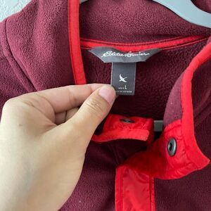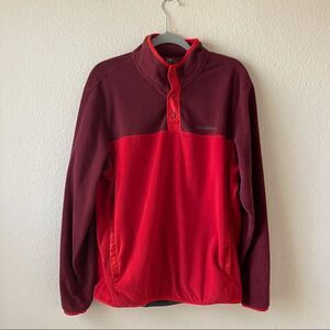 Men’s size large. No flaws. Super soft fleece. Lightweight warmth. Has the side pockets and snap front details.
