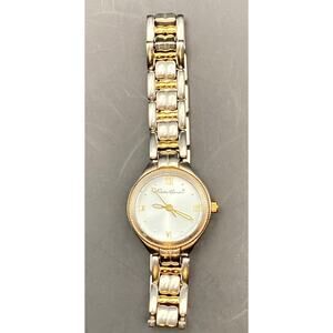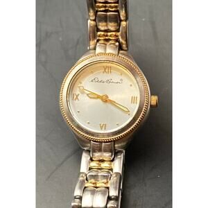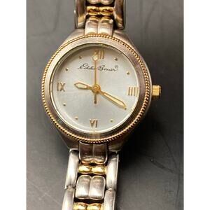 This is a stylish Eddie Bauer women's petite watch, model 0085, featuring a minimalist design with gold and silver tones.