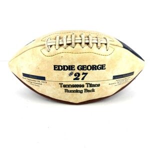 Wilson commemorative NFL football featuring Tennessee Titans running back Eddie George #27. Displays his player image, stats, and career highlights with Titans logo. Official size, designed as a collector/display ball.