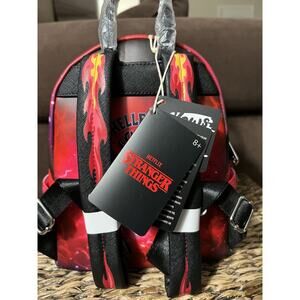 Get ready to take on the Demobats with this Stranger Things-inspired mini backpack! Featuring an applique of Eddie Munson playing the guitar, the front also includes glow-in-the-dark lightning details. With a Hellfire Club logo on the back, flames on the adjustable straps, and side pockets, this backpack is perfect for traveling to the Upside-Down. Measures 9" W x 10 1/2" H x 4 1/2" D