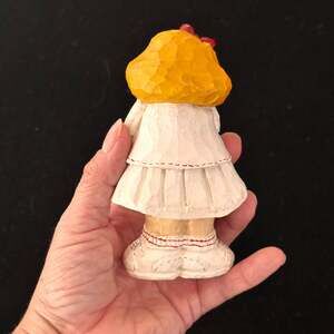 This charming vintage figurine from Eddie Walker for Midwest of Cannon Falls depicts a cheerful little girl dressed in tennis attire, holding a racket. Her blonde hair is topped with a red bow, and she wears a white pleated dress with red accents. This ha