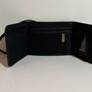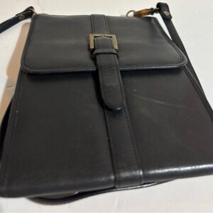 Sleek black crossbody bag with stylish gold accents. Perfect for any occasion compartment 8 5 cards slots minor scratches marks hight 7.5” wide 6” strap drop 22”