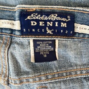 Eddie Bauer 100% cotton 5 pocket jeans, straight leg, size 18 petite. Button fly. Approximate measurements are waist 18”, rise 12”, inseam approximately 29”.
