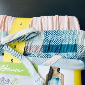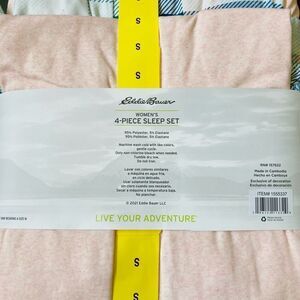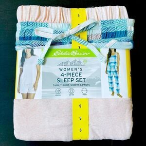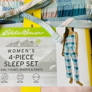 NWT women’s size Small Eddie Bauer 4-piece PJ night sleep or lounge set. Includes tank top, T-shirt, shorts and pajama pants. Breathable, easy care, stretch, soft and comfortable. Light pink and teal aqua blue plaid colors.