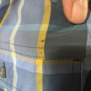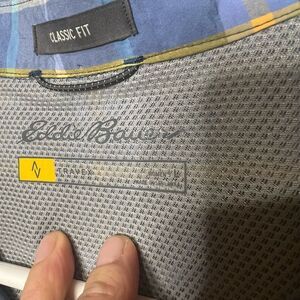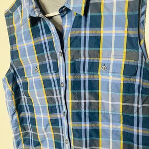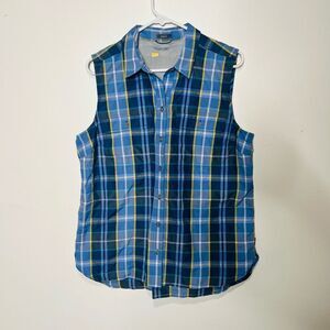 Eddie Bauer Travex Classic Fit Sleeveless Plaid Tank Top Collared Hiking Outdoor Shirt Blue Yellow Women’s Large