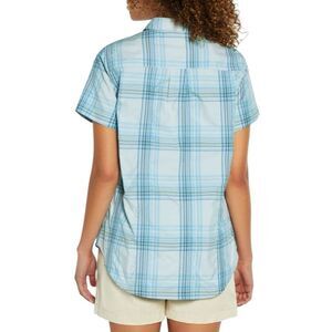 With an easy tapered fit cut from a woven performance fabric, the Eddie Bauer Ladies' Outdoor Top features a collared button-up front, short sleeves, and a rounded shirttail hem that provides a bit of extra length and coverage. There is plenty of pocket space (breast pockets with buttoned flaps and a single utility compartment on the side seam), and the tech fabric boasts both moisture-wicking properties and built-in UPF sun protection. Pack it for your next hike or camping trip-the secure buttoned chest pockets are perfect for stowing keys and other essentials-or wear it for picnics and other weekend outings under an especially bright sun. The classic button-up design makes it perfect for pairing with just about any bottoms.