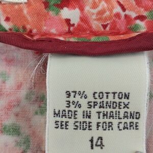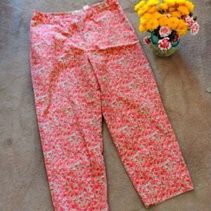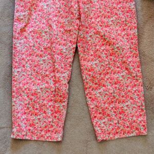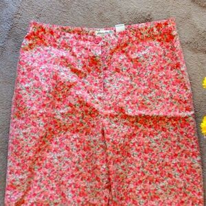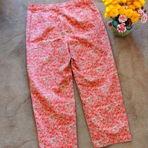 So cute , these pants have a little spandex for stretch. Pretty floral. Front zip with button. Size 14 measures 44 at hips, higher 12 inch rise.25.5 inch inseam. 17 inch leg opening. Just perfect.