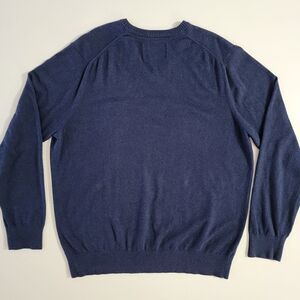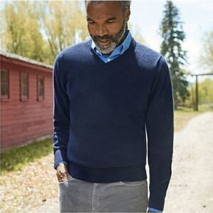 Wonderfully soft men's v-neck sweater from Eddie Bauer in versatile navy is made of cotton with just the perfect amount of cashmere for that smooth feel. Great under a sport coat or dress up your favourite jeans. This sweater is in awesome condition.