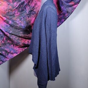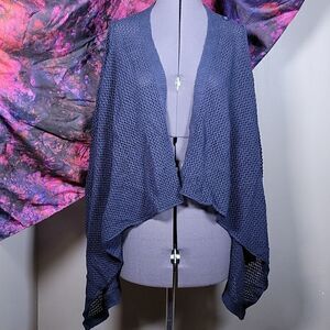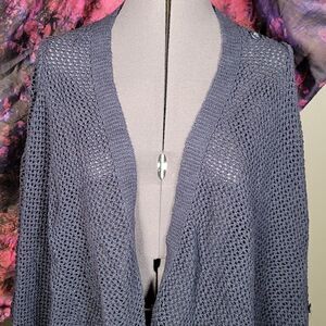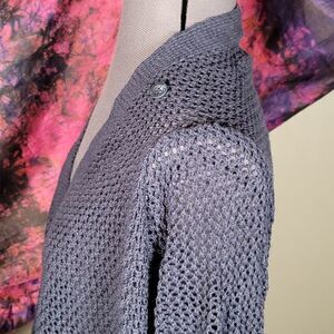 This crochet open cardigan from Eddie Bauer has lots of extra material so you can wrap yourself up in this hi-low look. It also has a few strategically placed buttons but no button holes. I'm guessing you can use the buttons through the crochet-work to close it around you in a variety of different ways. This is a sample item which means it should only ever have been worn by models; never sold. Size may vary slightly.