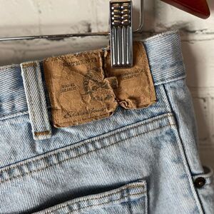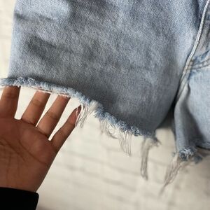 Shorts were cut off but created a great piece, they ae distressed from hem and they are a light wash color.