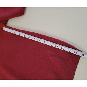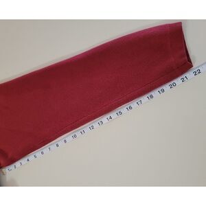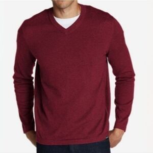 V-neck sweater by Eddie Bauer in a deep shade of red is in good condition! This is a medium to heavyweight sweater and does have some loose stitches as shown in photos.