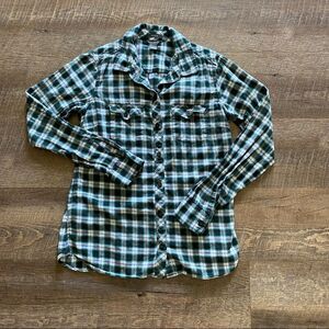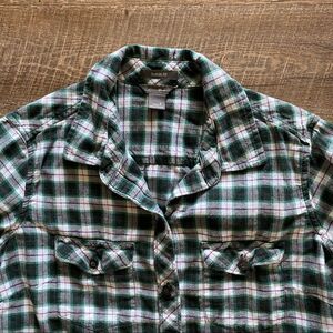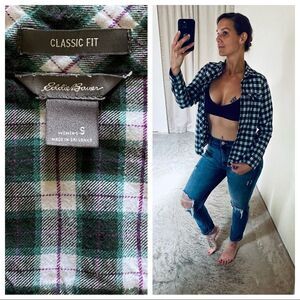Classic Fit plaid button down in dark green, purple, black and white from Eddie Bauer. I love to wear flannel button downs “half tucked”. Also cute tied in front. Dual flap button chest pockets. Material: 100% cotton. Please see photo section for approximate flat measurements + my model stats.