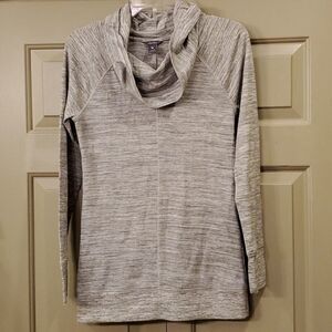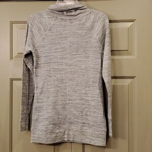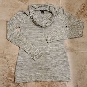 In like new condition. Green with gray and white running through it. Cowlneck is super soft and stylish, keeps you warm without the bulk of a scarf or tightness of a turtleneck. Thermal feel on the body sleeves are more of a ribbed style. Pretty color will go with everything any season. Feel free to ask questions and make offers