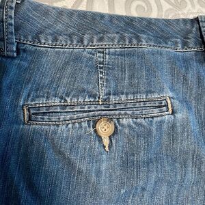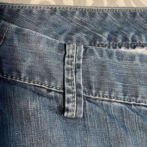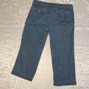 Eddie Bauer crop blue jeans lightly distressed size 10. 4 pockets. The two back pockets are welt with a button. Famous Eddie Bauer quality.