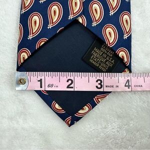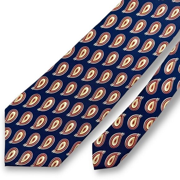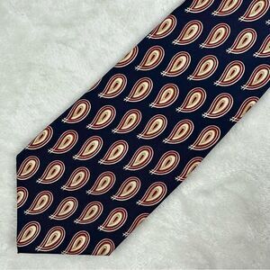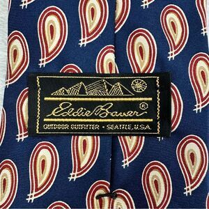 Eddie Bauer navy with red & gold teardrop print 100% silk tie. Very good preowned condition.