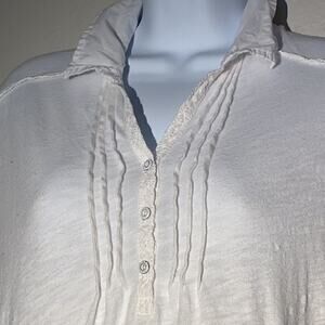 Super cute top for the summer. Matches everything. Button detailing on the shoulders. This is a looser fit shirt and would fit a medium. See pictures for measurements.