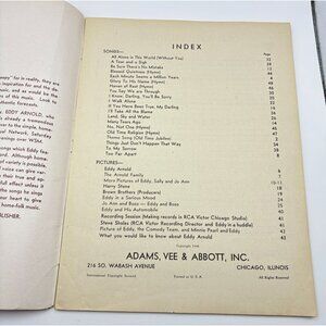 Step back into the golden age of country music with this classic 1946 Eddy Arnold songbook. Featuring treasured hymns and hits such as "I Walk Alone" and "Old Time Religion," this collectible takes you on a nostalgic journey through timeless melodies. Published by Adams, Vee & Abbott Inc., it includes forewords, pictures, and sheet music that made Eddy Arnold a household name of his era. A wonderful piece of music history and a window into the charm of mid-20th-century Americana.