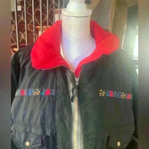 Edelweiss Vintage winter coat. Mid-weight. Large. Black and Red. Floral trim.
