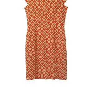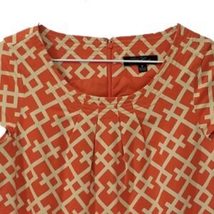 Lovely nod to mod inspired sheath dress printed in a stylish orange & beige geometric pattern. Scoop neckline. Pleated collar. Cap sleeves. Concealed zipper and hook & eye closure on the back. Slit on the back. Features optional belt loops to pair with favorite belt. Fully lined.