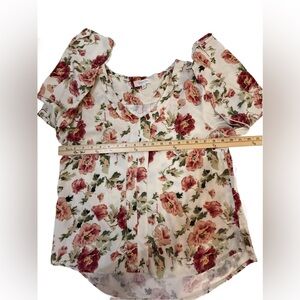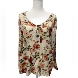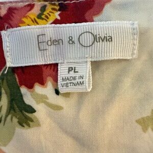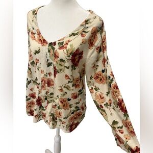 Discover effortless style with this Eden & Olivia blouse, featuring a relaxed fit and asymmetrical design. The cream base is beautifully adorned with red floral patterns, while the long cuffed sleeves add a touch of sophistication. Perfect for a chic, laid-back look.