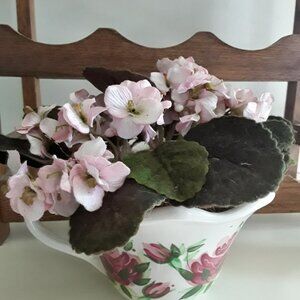* The floral arrangement is a large ceramic cup with a handle with artificial impatien flowers