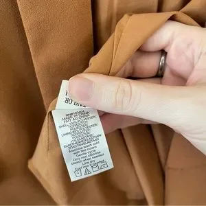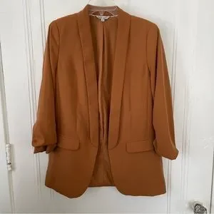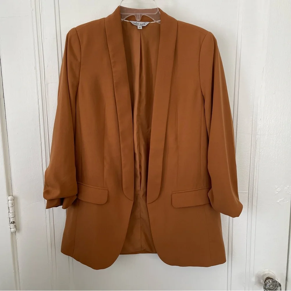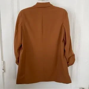 Classic women’s blazer in camel color, with ruched sleeves, welted front pockets, and lightly padded shoulders. Very lightly worn!