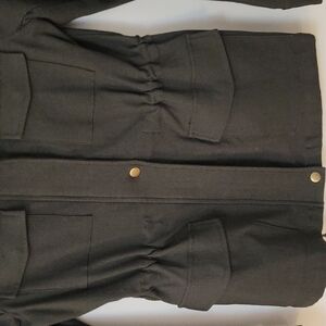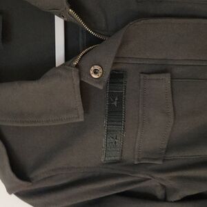 Cinches at the waist with an inside draw string. 4 front pockets. Brass zipper and snap buttons.
