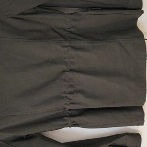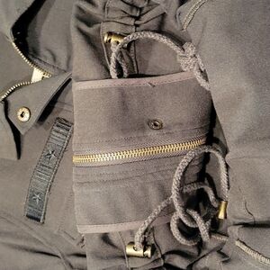 Cinches at the waist with an inside draw string. 4 front pockets. Brass zipper and snap buttons.
