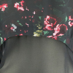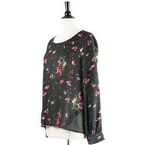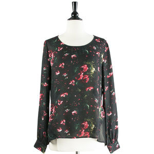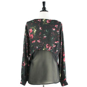 Black long-sleeve floral chiffon top with shades of red, green, white and beige. Round neckline, fitted sleeve cuff with shirred detail and a solid black chiffon panel in back.