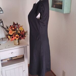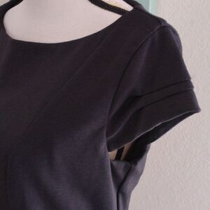 Knit dress with seaming for interest. Princess seams that wrap around the hips. Tucked cap sleeves. Fully lined, back zip. Size 6 measures 38 at chest, 32 at waist, 34 at hips, 37.5 long from shoulder to hem. The perfect dress for work or after.