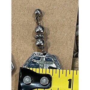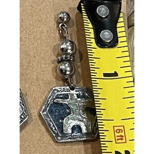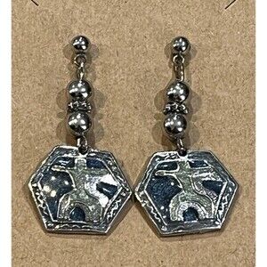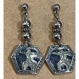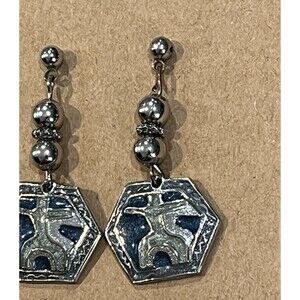 The Edgar Berebi VTG Earrings in blue enamel and silver tone are a vintage pair of dangle earrings signed by the brand. These boho-style earrings feature a triangle shape with a tribal and Southwestern theme. Made of stainless steel with a silver base metal, these earrings are perfect for special occasions such as Mother's Day, Christmas, anniversaries, birthdays, and more. With a unique design and vintage appeal, these earrings add a touch of art to wear to any outfit. Made in the United States in the 1980s, these earrings are a stylish and one-of-a-kind accessory for women.