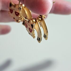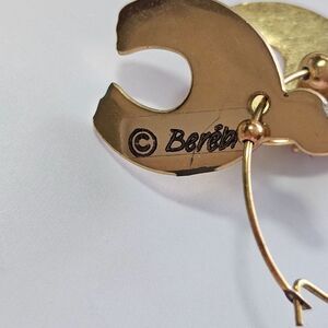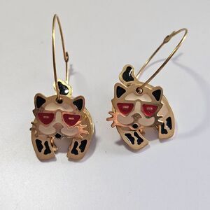 Pretty earrings are gold colored cats with red sunglasses. Marked Berebi.
