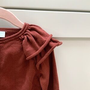 Edgehill Collection burnt orange /terracotta with ruffle details on the shoulders. Perfect button up cardigan for layering, making it a great fall staple. Excellent quality with no flaws and fits true to size.