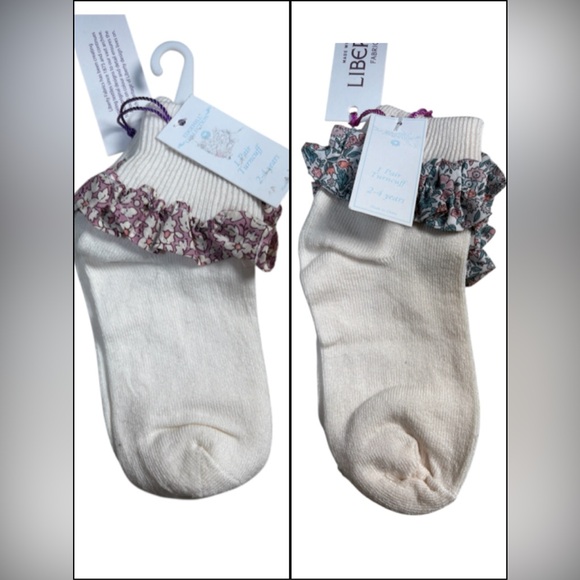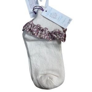 Charming cream socks with floral ruffle trim. Stylish and fun for kids.