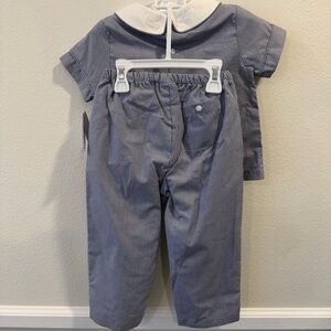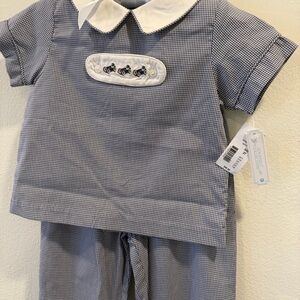 From Edgehill Collection, this 2-piece set features: Top: Gingham top with Peter Pan collar Short, cap sleeves Pleat down the middle Removeable tab Pullover construction Bottom: Matching gingham pants Pull-on construction