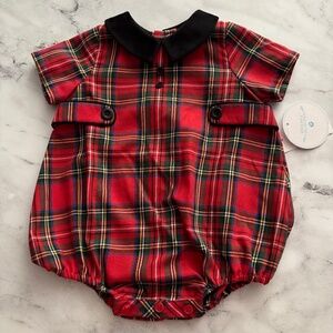 Edgehill Collection Nwt Red Plaid Holiday w/ Velvet Collar Boy's Shortall Romper