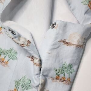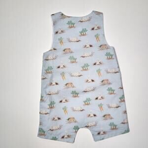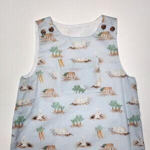 Blue bunny rabbit print baby boy jumper from Edgehill Collection Pearly Gates. Buttons at the shoulder. Snaps along the bottom and at the sides. Lined
