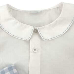 White shirt has blue stitching at the peter pan collar and arms