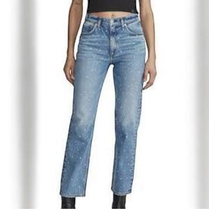 In excellent pre-owned condition! Super sexy embellished diamond looking gems on the front of the jeans! Glam up for a night on the town like Rita Ora with a simple white collar button down shirt or a black tank bodysuit, high heels and sparkling jewelry! Taylor Swift wore similar jeans to a Kansas City Chiefs game, so get dolled up for a football game with these too!