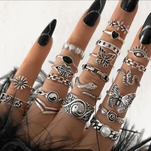 NWOT Edgy 21-Piece Punk Ring Set – Unisex Butterfly, Snake & Rose Zinc Alloy Collection for Daily Wear