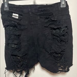 These black jean shorts feature extensive distressing and frayed hems, offering a bold and edgy look. The raw cut-off style and horizontal tears add a grunge-inspired aesthetic, perfect for making a statement. Ideal for casual outings, these shorts combine comfort with a trendy, worn-in appearance.