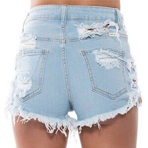 denim shorts, stretch denim, asymmetrical waistband, side cutouts, distressed hem, high-rise waist, working back pockets, button-up closure, zipper closure, cheeky bottom, light blue wash, comfort stretch, unique garment, 98% cotton, 2% spandex
