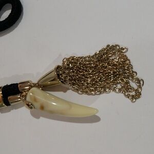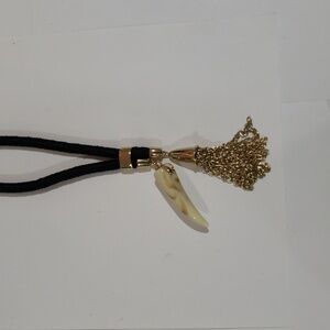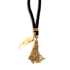 Add boho flair with this chic gold-tone black cord necklace featuring a tassel and faux tooth pendant. Stylish and lightweight, it’s perfect for everyday wear or dressing up your look. A trendy statement piece and a great gift for her.