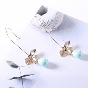 Edgy Minty Blue Teardrop Pearl Orchid Flower Gold Plated Long Earrings