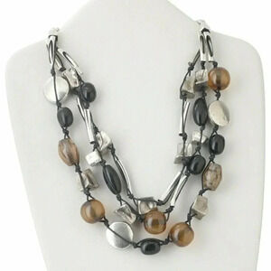 Handcrafted Mixed Media Metal Lucite Triple Strand Statement NecklaceNecklace splits into three strands of graduated lengthFeatures modern and vintage lucite and metal beadsEclectic and edgy mix of textures and materialsMix of silver, black, and tan/brown earth tonesHandcrafted artisan piece not available in any storeMeasures 22" long overallSterling silver plated hook clasp and 3" extender chain for varying lengthGreat presence and heft in an unforgettable statement style