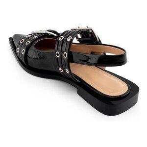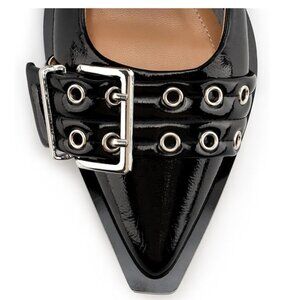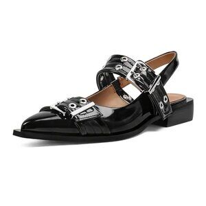 These black, pointed-toe flats are the perfect blend of modern sophistication and rebellious style. Featuring bold silver hardware and multiple adjustable buckle straps across the vamp and a secure slingback ankle.
